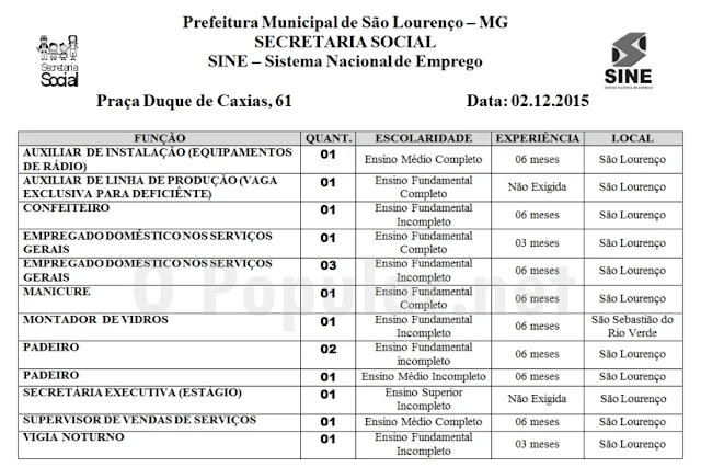 O Sine (Sistema Nacional de Emprego) situado no primeiro piso do prédio da Prefeitura Municipal de São Lourenço está com novas vagas e oportunidades de emprego para diversos setores profissionais.