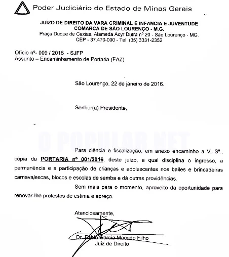 O Meritíssimo Juiz de Direito da Vara da Infância e da Juventude da Comarca de São Lourenço, Dr. Fábio Garcia Macedo Filho, divulgou na tarde desta terça- feira (26/01), a Portaria nº 001/2016, que trata de disciplinar o ingresso, a permanência e a participação de crianças e adolescentes nos bailes e brincadeiras carnavalescas, blocos e escolas de samba.