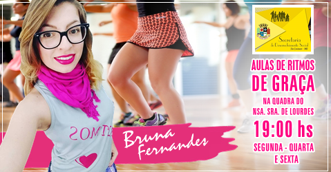 Um projeto social que visa levar a dança ao alcance de todos, esta oferecendo aula de ritmos GRATUITAS para qualquer pessoa que queira participar. Em parceria com a Sec. de Desenvolvimento Social e apoio da Sec. de Esportes, toda segunda, quarta e sexta-feira das 19:00 às 21:00hs na quadra do Bairro Nossa Senhora de Lourdes, aulas de ritmos com a professora Bruna Fernandes.